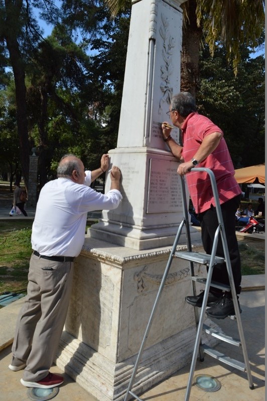 Ο κ. Αδαμόπουλος, συνοδευμένος από τον αντιπρόεδρο του ιδίου Συνδέσμου και Αγιογράφο, Χρήστο Δέλλα, λειτουργώντας άμεσα, προέβησαν το πρωί της Δευτέρας 12 Οκτωβρίου 2020 στην χρωματοποίηση των φθαρμένων από το χρόνο αναγραφόμενων στο μνημείο ονομάτων και του επιγράμματος.