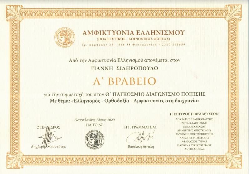Η Πρόεδρος και το Διοικητικό Συμβούλιο του Δικηγορικού Συλλόγου Κατερίνης, εκφράζουν τα θερμά τους συγχαρητήρια στον τ. Πρόεδρο, συνάδελφο και φίλο Γιάννη Σιδηρόπουλο για την σπουδαία διάκρισή του, στον Θ΄ Παγκόσμιο Διαγωνισμό Ποίησης, στον οποίο μεταξύ τετρακοσίων και πλέον συμμετεχόντων έλαβε το Πρώτο Παγκόσμιο Βραβείο Ποίησης για το ποίημά του με τίτλο