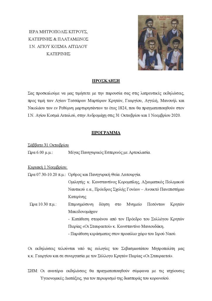 Λατρευτικές εκδηλώσεις προς Τιμή των Αγίων Τεσσάρων Μαρτύρων Κρητών στον Ιερό Ναό Αγίου Κοσμά του Αιτωλού Κοινωνία 31 Οκτωβρίου 202031 Οκτωβρίου 2020Pieria Social