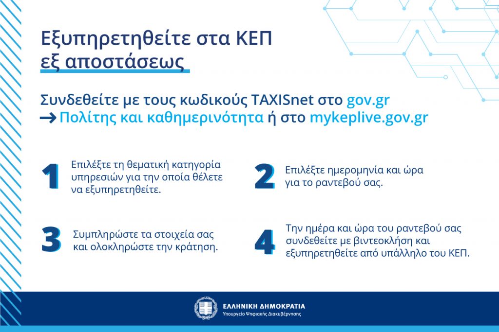Υπενθυμίζεται ότι τα ψηφιακά ραντεβού στα ΚΕΠ διεξάγονται κατόπιν ραντεβού μέσω του myKEPlive.gov.gr. Η υπηρεσία διεκπεραιώνει μέσω βιντεοκλήσης διαδικασίες υψηλής ζήτησης για τέσσερις κατηγορίες υπηρεσιών: 1) Πληροφόρηση – Αίτηση, 2) Εξυπηρέτηση από το δήμο σας, 3) Εξυπηρέτηση πολιτών με Αναπηρία και 4) Υπηρεσίες προς επιχειρήσεις. Οι ώρες εξυπηρέτησης που μπορούν να επιλέξουν οι πολίτες είναι από τις 08:00 έως τις 14:30.