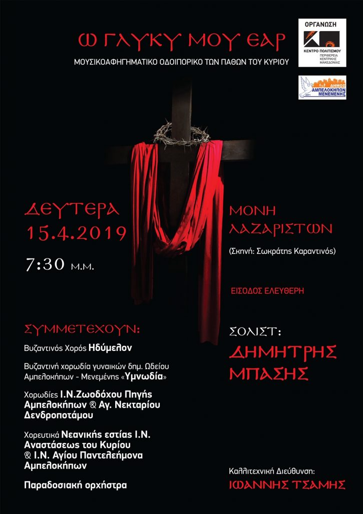 Το Κέντρο Πολιτισμού Περιφέρειας Κεντρικής Μακεδονίας σε συνδιοργάνωση με την Αντιδημαρχία Πολιτισμού και Εθελοντών του Δήμου Αμπελοκήπων – Μενεμένης διοργανώνουν μία όμορφη εκδήλωση, με σημείο αναφοράς το Θείο Δράμα και την Πορεία από το Θείο Πάθος στην Ανάσταση, με τη συμμετοχή του καταξιωμένου καλλιτέχνη, Δημήτρη Μπάση.