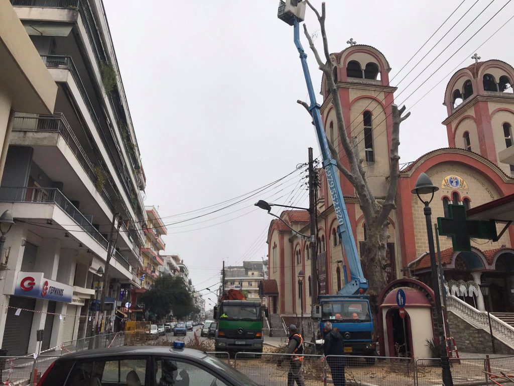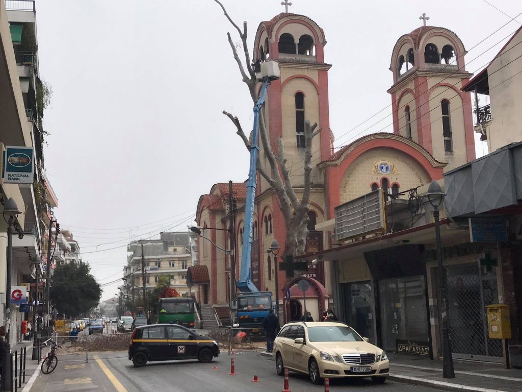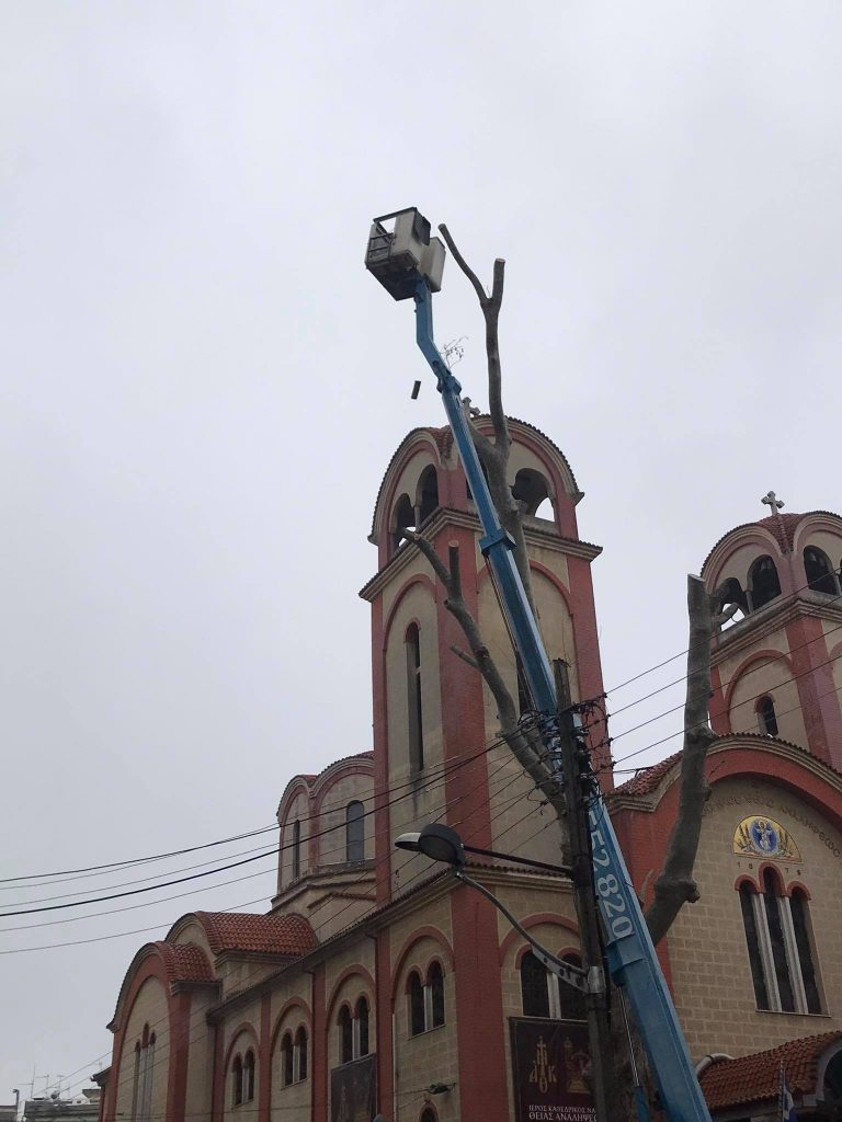 Δημοτική αστυνομία και Τροχαία, απέκλεισαν τους δρόμους πέριξ, προκειμένου να μην υπάρξει κίνδυνος για διερχόμενους πεζούς και οχήματα, ενώ συνεργείο της ΔΕΗ έλαβε όλα τα απαιτούμενα μέτρα. Οι εργασίες που συνιστούσαν διαχρονικό αίτημα της τοπικής Εκκλησίας ολοκληρώθηκαν από συνεργείο της υπηρεσίας Περιβάλλοντος & Πρασίνου, σε συνεργασία με τη Διεύθυνση Δασών, βάσει μελέτης του Α.Π.Θ., παρουσία του Δημάρχου Κώστα Κουκοδήμου, υπό την επίβλεψη του αρμόδιου αντιδημάρχου Κώστα Τσιουκάνη.