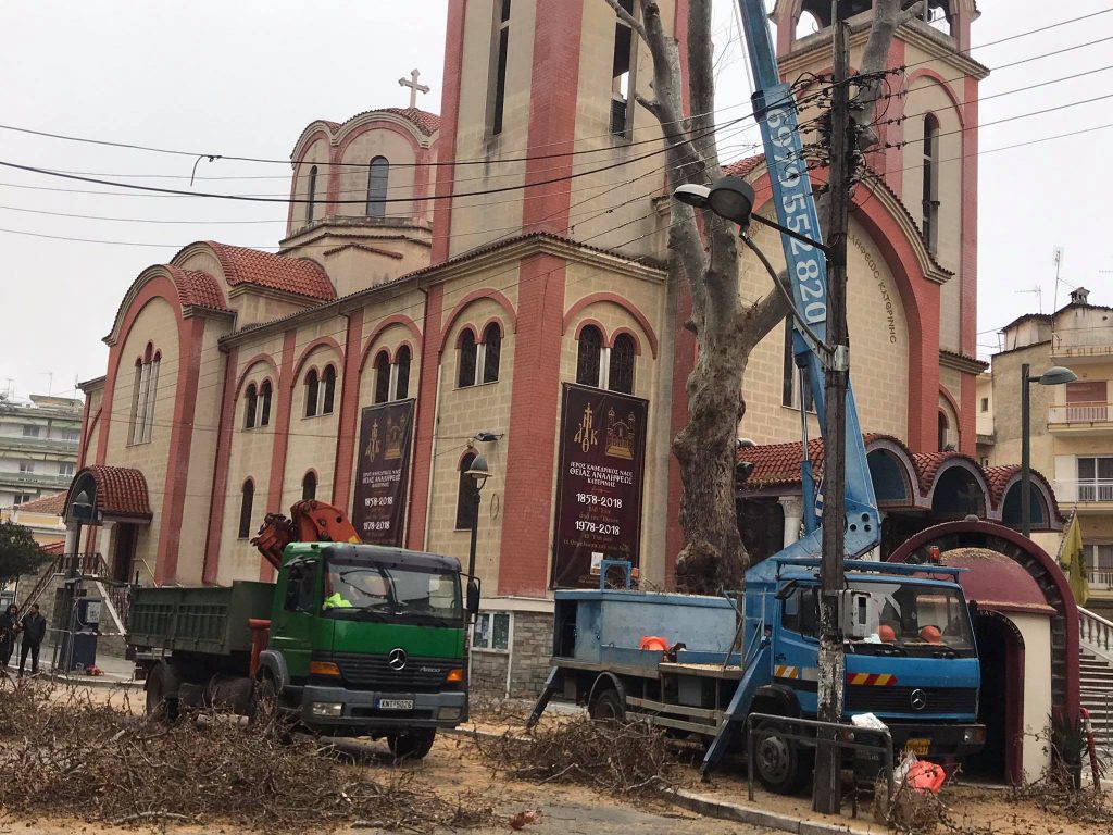 Ολοκληρώθηκαν σήμερα το πρωί οι προληπτικές – δραστικές κλαδεύσεις αποφόρτισης του πλατάνου στον αύλειο χώρο του Καθεδρικού Ιερού Ναού Θείας Αναλήψεως, με σκοπό να μειωθεί το φερόμενο φορτίο του και κατ’ επέκταση ο κίνδυνος πρόκλησης ατυχήματος.