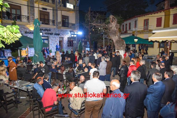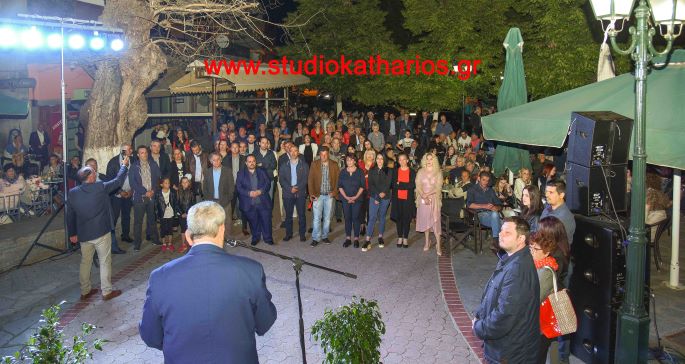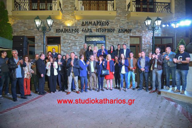 Πλήθος κόσμου παρακολούθησε την ομιλία του υποψηφίου δημάρχου Παναγιώτη Καζά, στην Κεντρική Πλατεία του Κολινδρού, την Κυριακή 19 Μαΐου 2019 το βράδυ.
