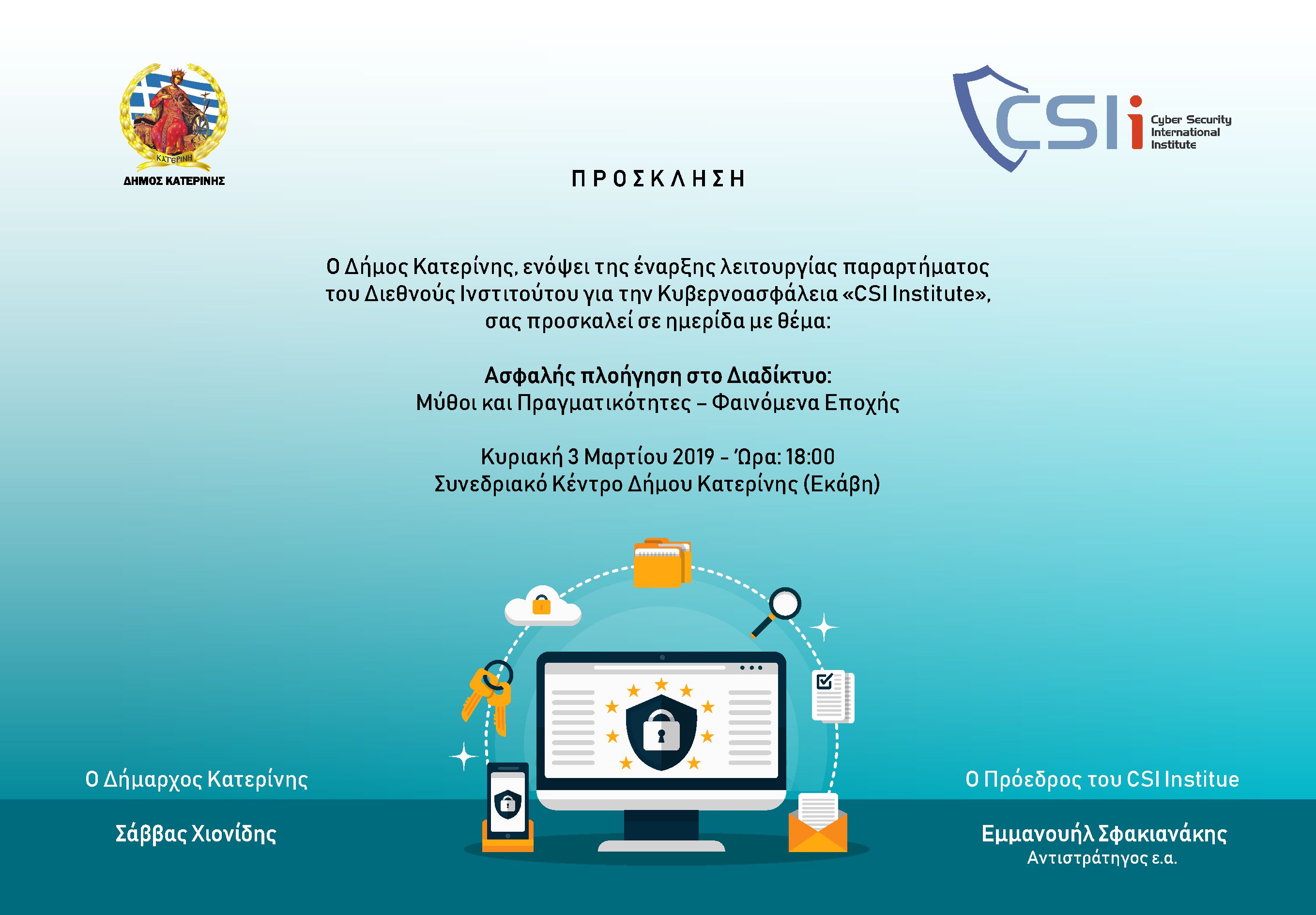 Διεθνές Ινστιτούτο για την Κυβερνοασφάλεια CSI Institute-Ημερίδα στο Συνεδριακό Κέντρο Κατερίνης Κοινωνία 28 Φεβρουαρίου 201928 Φεβρουαρίου 2019Pieria Social