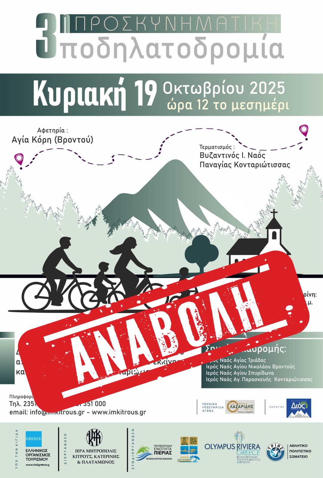 Λόγω των ακραίων καιρικών φαινομένων που επικρατούν στην Πιερία, η προγραμματισμένη για σήμερα 4-12-2025 εκδήλωση της ΣΑΕΚ ΓΝΚ και του ΣΔΕ Κατερίνης στον Πνευματικό Κέντρο του δήμου Κατερίνης «Ψυχική υγεία και ασθένεια στη λογοτεχνία», αναβάλλεται Η νέα ημερομηνία θα ανακοινωθεί προσεχώς.