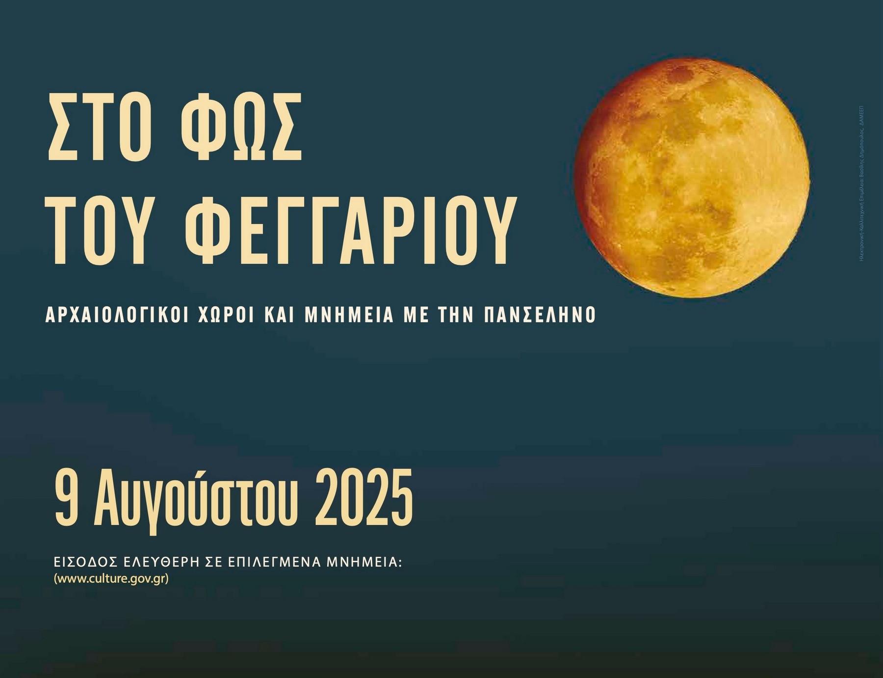 Το Υπουργείο Πολιτισμού διοργανώνει και φέτος, τις εκδηλώσεις της Αυγουστιάτικης Πανσελήνου, υπό τον συντονισμό της Γενικής Διεύθυνσης Αρχαιοτήτων και Πολιτιστικής Κληρονομιάς, προσφέροντας ελεύθερη είσοδο σε επιλεγμένους αρχαιολογικούς χώρους, τη νύχτα της Πανσελήνου, το Σάββατο 9 Αυγούστου 2025. Εκατόν (114) δεκατέσσερεις αρχαιολογικοί χώροι, ιστορικοί τόποι, μουσεία και μνημεία, σε ολόκληρη τη χώρα, θα υποδεχθούν το κοινό, […]