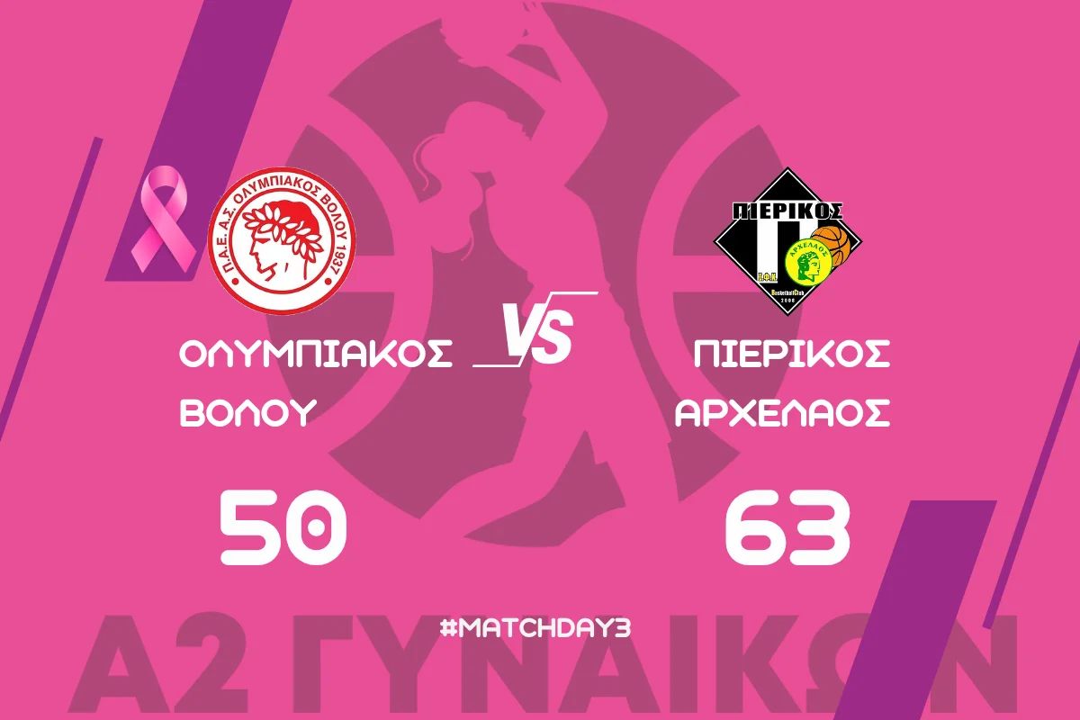 Α2 Εθνική Κατηγορία Γυναικών (3η αγωνιστική): ΑΣ Ολυμπιακός Βόλου – ΣΦΚ Πιερικός Αρχέλαος 50-63