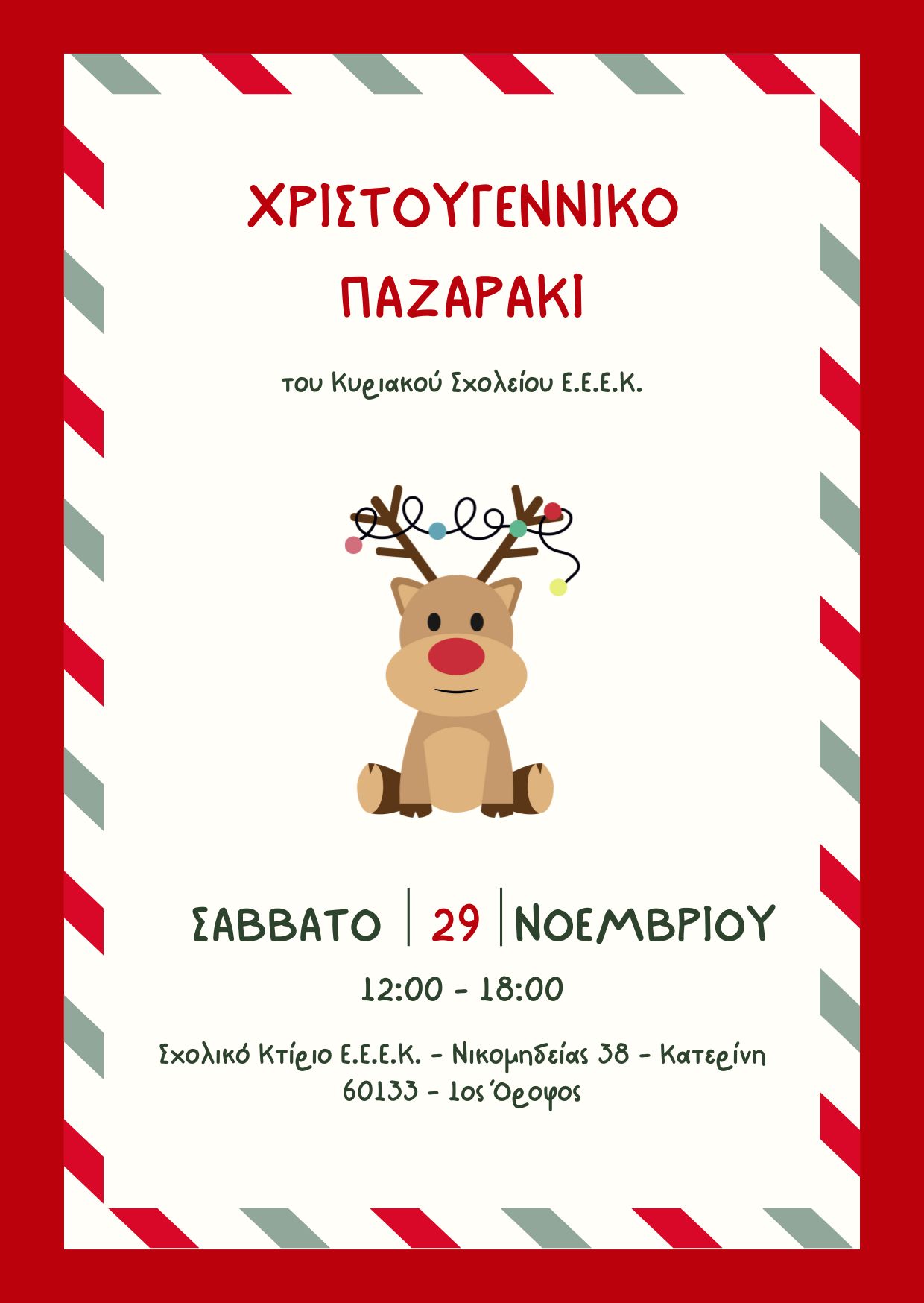 Σε γιορτινό κλίμα και με διάθεση προσφοράς, τα παιδιά και οι δάσκαλοι του Κυριακού Σχολείου της Ευαγγελικής Εκκλησίας Κατερίνης υποδέχονται και φέτος του επισκέπτες της καθιερωμένης χριστουγεννιάτικης αγοράς. Το «Χριστουγεννιάτικο Παζαράκι» διοργανώνεται αυτό το Σάββατο 28 Νοεμβρίου 2025, από τις 12:00 έως τις 18:00, στο σχολικό κτίριο της Ευαγγελικής Εκκλησίας Κατερίνης, (Νικομηδείας 38, 1ος όροφος). […]
