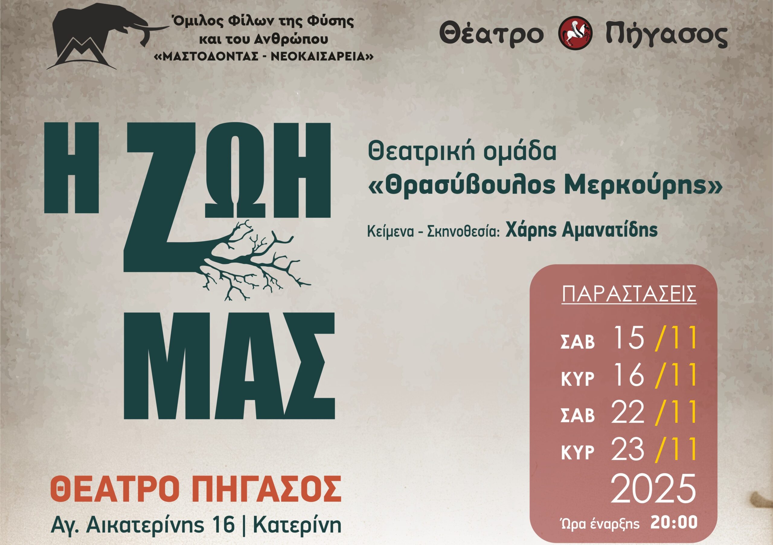 Η Θεατρική Ομάδα «Θρασύβουλος Μερκούρης» παρουσιάζει την πολυαναμενόμενη παράσταση «Η ΖΩΗ ΜΑΣ», ένα έργο που αποτελεί φόρο τιμής στην ιστορία και την ταυτότητα της Πιερίας. Το έργο θα κάνει πρεμιέρα το Σάββατο 15 Νοεμβρίου 2025 στις 20:00 και θα δοθούν τέσσερις (4) μοναδικές παραστάσεις (15, 16, 22 και 23 Νοεμβρίου 2025). ΠΕΡΙΛΗΨΗ & ΘΕΜΑΤΙΚΗ: Η Ιστορία που μας Ενώνει Η […]