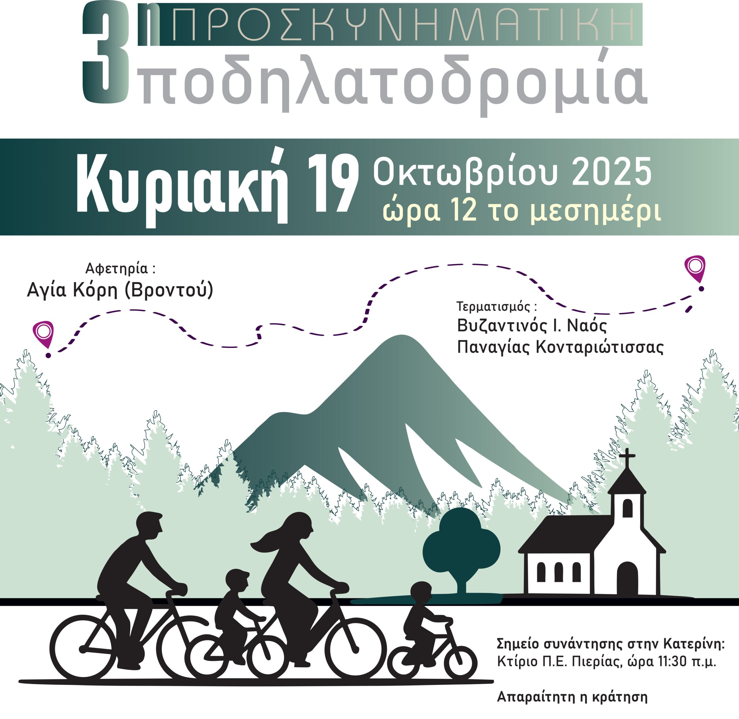 Στην τελική ευθεία οι προετοιμασίες της 3ης Προσκυνηματικής Ποδηλατοδρομίας της Ιεράς Μητρόπολης Κίτρους, Κατερίνης και Πλαταμώνος Την Κυριακή 19 Οκτωβρίου 2025 και ώρα 12 το μεσημέρι θα πραγματοποιηθεί η «3η ΠΡΟΣΚΥΝΗΜΑΤΙΚΗ ΠΟΔΗΛΑΤΟΔΡΟΜΙΑ» που διοργανώνει η Ιερά Μητρόπολη Κίτρους με την Π.Ε. Πιερίας, τον Δήμο Δίου-Ολύμπου, τον Πιερικό Οργανισμό Τουριστικής Ανάπτυξης και Προβολής (Π.Ο.Τ.Α.Π.) και τον […]
