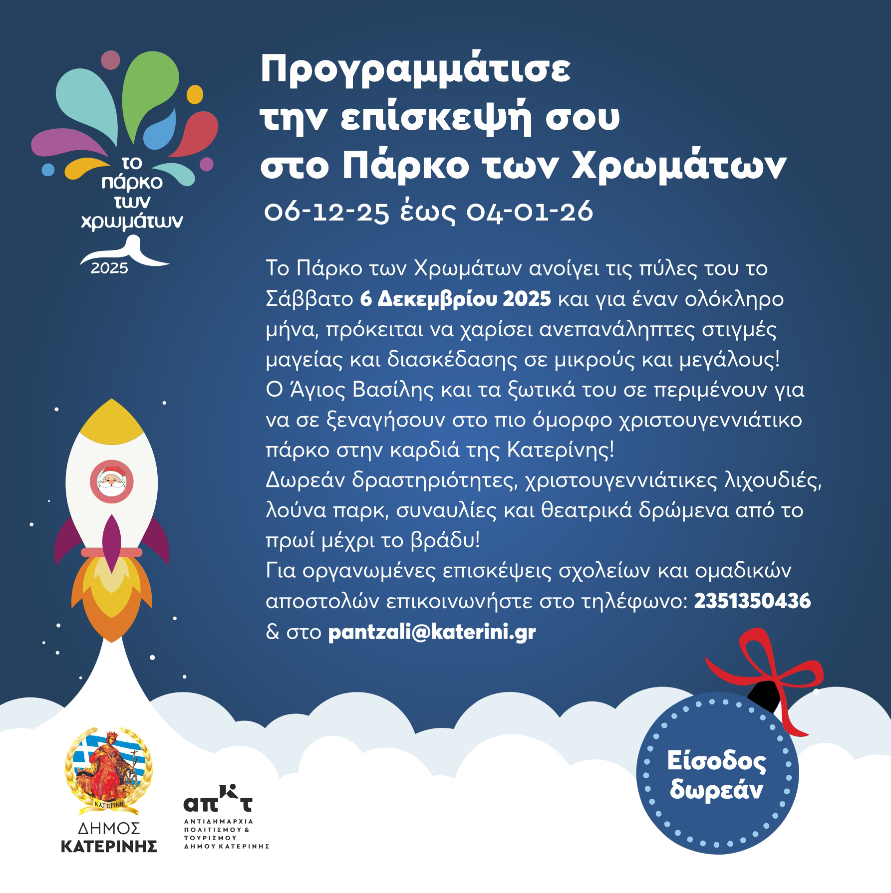 Το Πάρκο των Χρωμάτων στην Κατερίνη ανοίγει τις πύλες του το Σάββατο 06 Δεκεμβρίου, στις 20:00, με μια λαμπερή συναυλία της Κλαυδίας, η οποία σηματοδοτεί την επίσημη έναρξη ενός μήνα γεμάτου γιορτινή διάθεση, μουσική, φως και χρώματα. Η Κλαυδία, μία από τις πιο ξεχωριστές φωνές της σύγχρονης ελληνικής μουσικής σκηνής, με ιδιαίτερη χροιά και αισθαντική […]