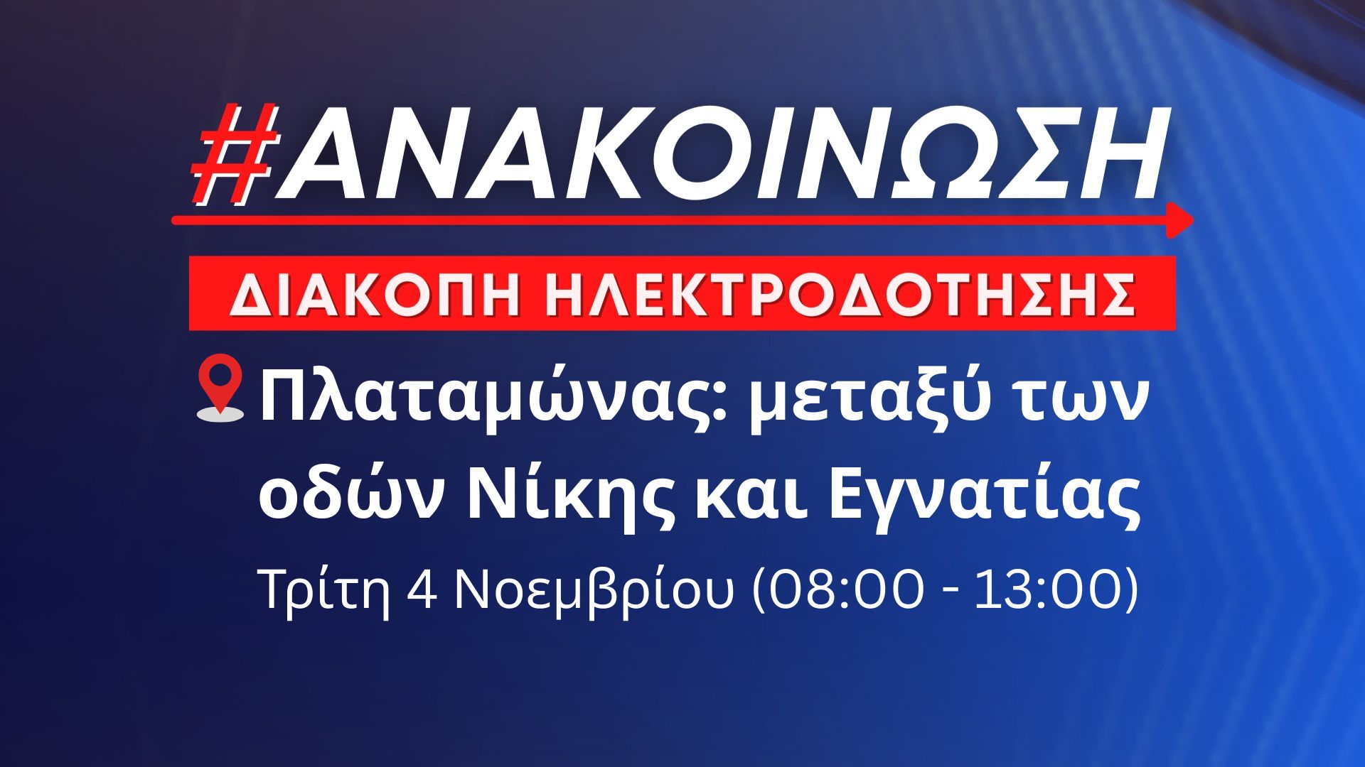 Σύμφωνα με ενημέρωση από τον ΔΕΔΔΗΕ την Τρίτη 4 Νοεμβρίου 2025 και ώρες 08:00-13:00 θα πραγματοποιηθεί προγραμματισμένη διακοπή ηλεκτροδότησης στη δημοτική κοινότητα Πλαταμώνα, στην περιοχή μεταξύ των οδών Νίκης και Εγνατίας. ΣΥΜΦΩΝΑ ΜΕ ΠΛΗΡΟΦΟΡΙΕΣ ΤΟΥ ΔΕΔΔΗΕ: https://siteapps.deddie.gr/outages2public