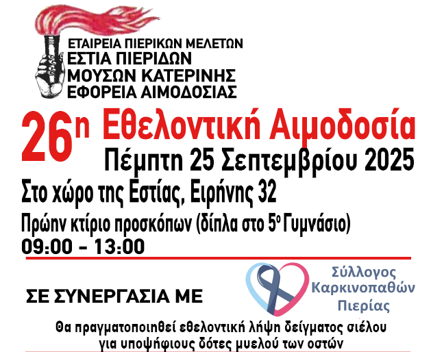 26η Εθελοντική αιμοδοσία, από την Εφορεία Αιμοδοσίας της Εστίας Πιερίδων Μουσών και τον Σύλλογο Καρκινοπαθών Κατερίνης
