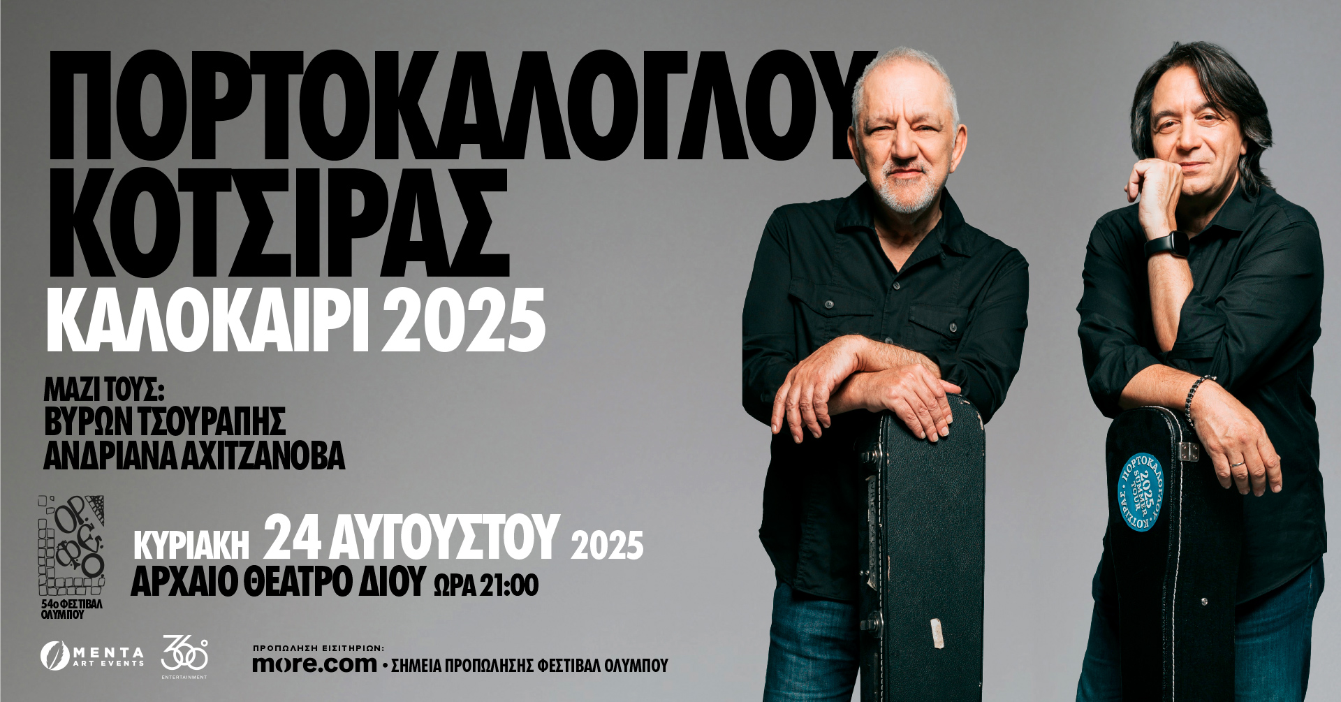 Δύο κορυφαίοι καλλιτέχνης της Ελληνικής μουσικής, ο τραγουδιστής και τραγουδοποιός Νίκος Πορτοκάλογλου και ο τραγουδιστής, συνθέτης και στιχουργός της λαϊκής και έντεχνης μουσικής Γιάννης Κότσιρας, εμφανίζονται την Κυριακή 24 Αυγούστου 2025 στις 9:00 το βράδυ στο αρχαίο θέατρο Δίου, στο πλαίσιο του 54ου Φεστιβάλ Ολύμπου. Υπόσχονται ότι θα μας προσφέρουν μια ξεχωριστή συναυλία και μια […]