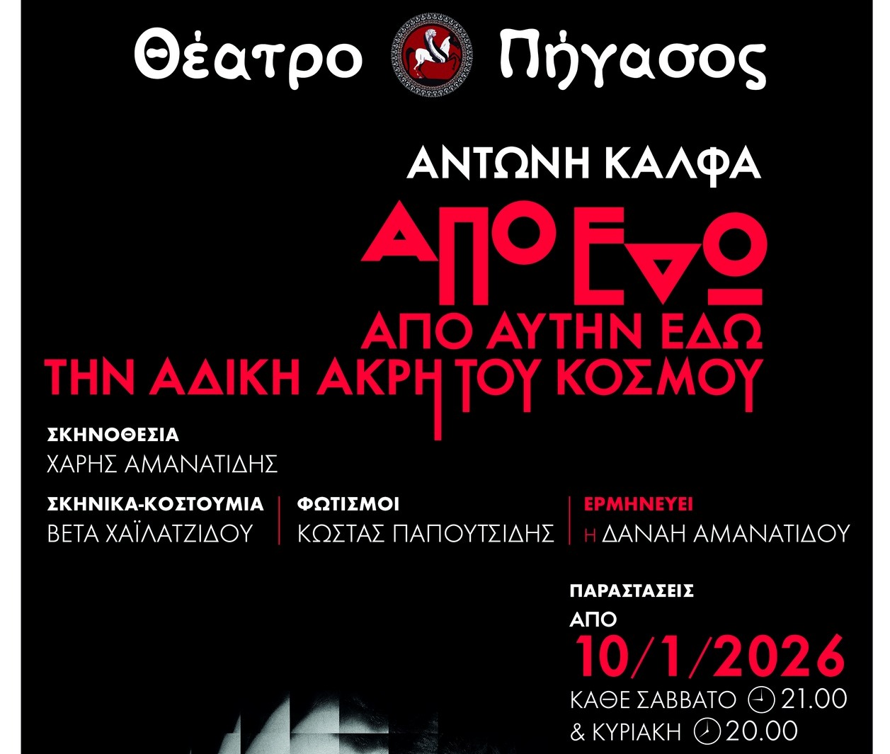 - Θέατρο Πήγασος: Από εδώ, από αυτήν εδώ την άδικη άκρη του κόσμου – Πρεμιέρα Σάββατο, 10 Ιανουαρίου 7 Ιανουαρίου 2026