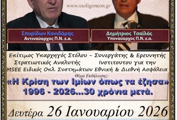 - «Η Κρίση των Ιμίων όπως τα έζησα… 30 χρόνια μετά» – Δευτέρα 26/1 στο Ανοικτό Πανεπιστήμιο Κατερίνης 20 Ιανουαρίου 2026