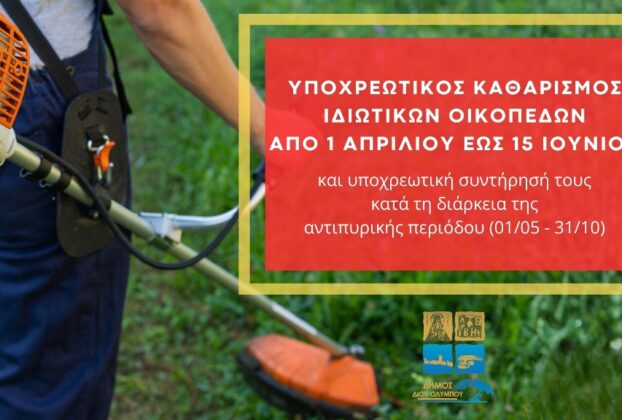 - Δήμος Δίου-Ολύμπου: Υποχρεωτικός καθαρισμός ιδιωτικών οικοπέδων από 1/4 έως 15/6 και υποχρεωτική συντήρησή τους 27 Μαρτίου 2026