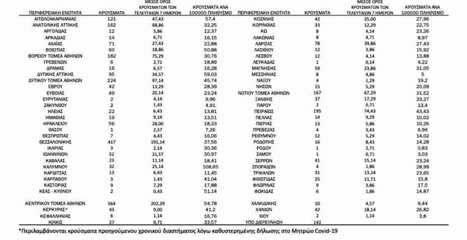 Με βάση τα επιβεβαιωμένα κρούσματα των τελευταίων 7 ημερών, 46 θεωρούνται σχετιζόμενα με ταξίδι από το εξωτερικό και 1.214 είναι σχετιζόμενα με ήδη γνωστό κρούσμα.