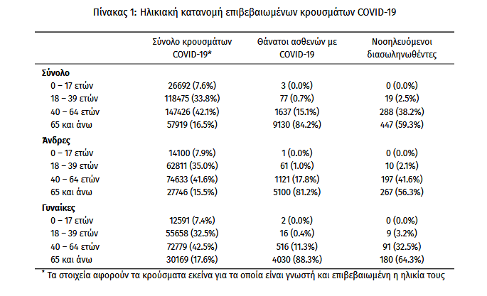 Οι νέοι θάνατοι ασθενών με COVID-19 είναι 83, ενώ από την έναρξη της επιδημίας έχουν καταγραφεί συνολικά 10.847 θάνατοι. Το 95.3% είχε υποκείμενο νόσημα ή/και ηλικία 70 ετών και άνω.