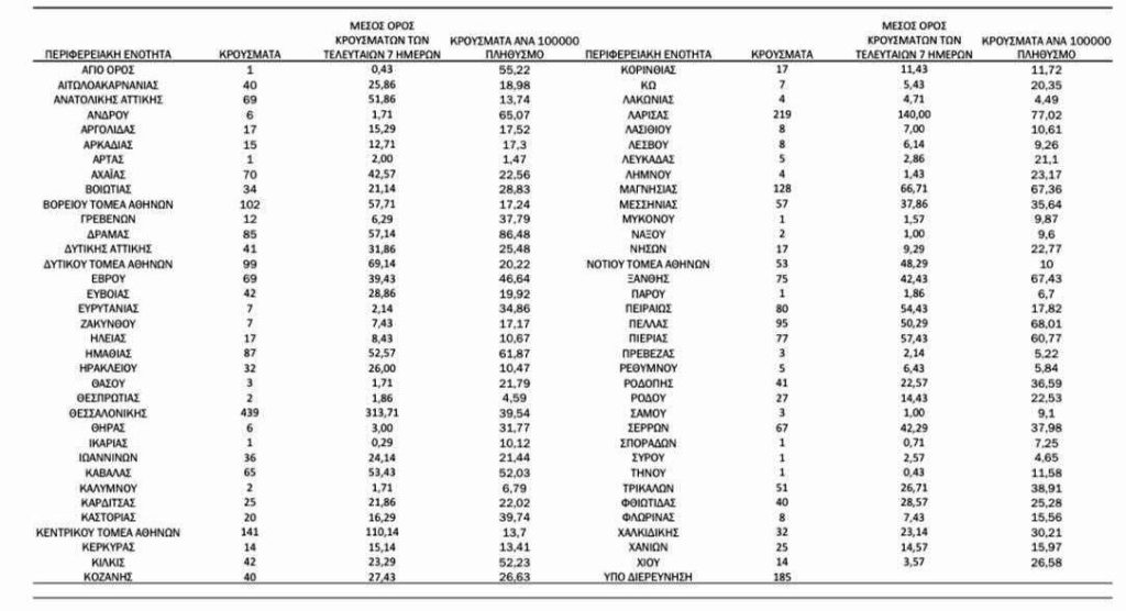 Με βάση τα επιβεβαιωμένα κρούσματα των τελευταίων 7 ημερών, 123 θεωρούνται σχετιζόμενα με ταξίδι από το εξωτερικό και 3.033 είναι σχετιζόμενα με ήδη γνωστό κρούσμα