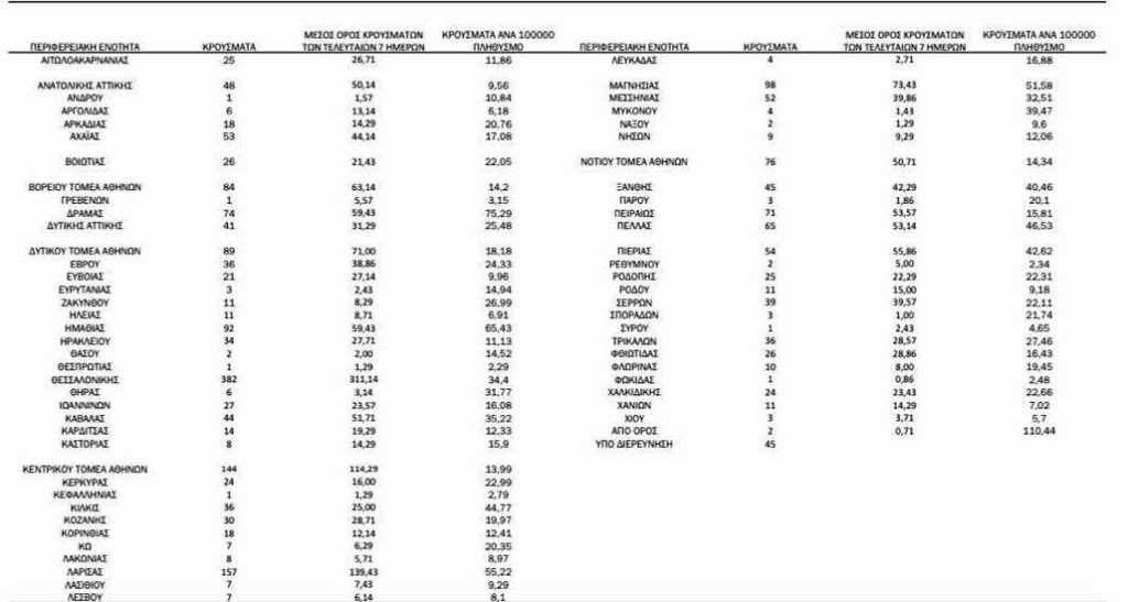 Με βάση τα επιβεβαιωμένα κρούσματα των τελευταίων 7 ημερών, 120 θεωρούνται σχετιζόμενα με ταξίδι από το εξωτερικό και 3.029 είναι σχετιζόμενα με ήδη γνωστό κρούσμα.