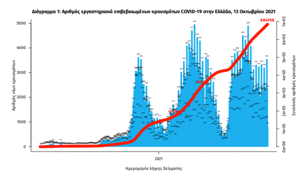 Τα νέα εργαστηριακά επιβεβαιωμένα κρούσματα της νόσου που καταγράφηκαν τις τελευταίες 24 ώρες είναι 2.338, εκ των οποίων 10 εντοπίστηκαν κατόπιν ελέγχων στις πύλες εισόδου της χώρας. Ο συνολικός αριθμός των κρουσμάτων ανέρχεται σε 684.706 (ημερήσια μεταβολή +0.3%), εκ των οποίων 50.9% άνδρες.